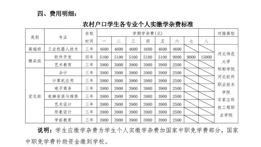 2.大專直通車精英班:學制三年,每年年學費7800 元(已刨除國補)每年住宿費800元(收前兩年) 石家莊財經學院特招班在五洲學制兩年每年學費8800元(已刨除國補)每年住宿費800元,第三年到石家莊財經學院學習,學費執行大專收費標準。